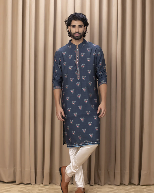 Blue Color Cotton Floral Print Kurta